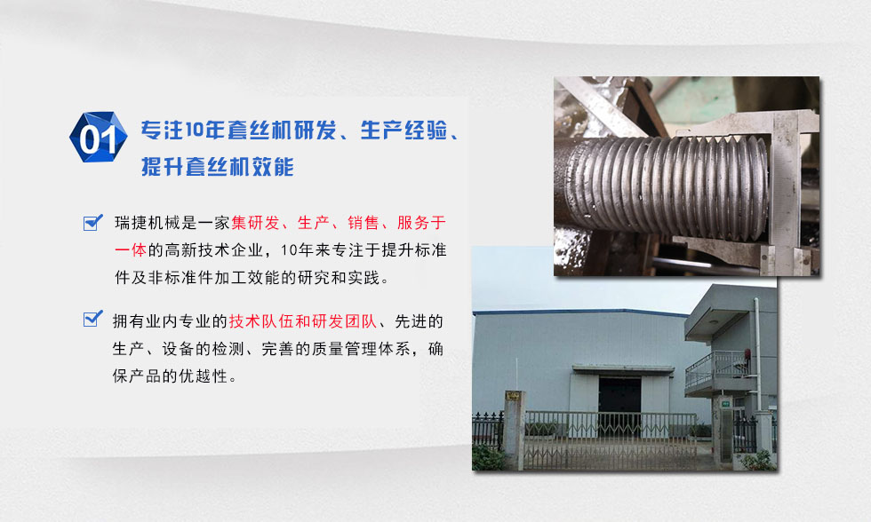 邢臺(tái)市瑞捷機(jī)械制造有限公司專業(yè)生產(chǎn)圓鋼套絲機(jī),鋼管套絲機(jī)兩大系列,其特點(diǎn)主要展現(xiàn)為機(jī)頭的優(yōu)化改進(jìn),大幅度提高了加工螺紋絲頭的精確度和工作效率,有效解決了本行業(yè)在加工絲扣上端部易扭轉(zhuǎn)變形(絲扣加易擴(kuò)口)、配件損耗高、加工效率低的技術(shù)難題。